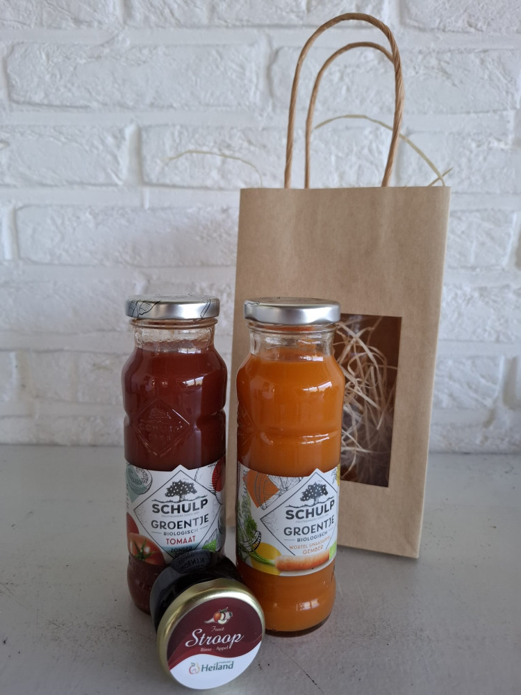 Hoe leuk is dit, om kleinigheid te geven aan iemand die het even gebruiken, 2 flesjes sap met een mini stroop. Lekker en leuk.