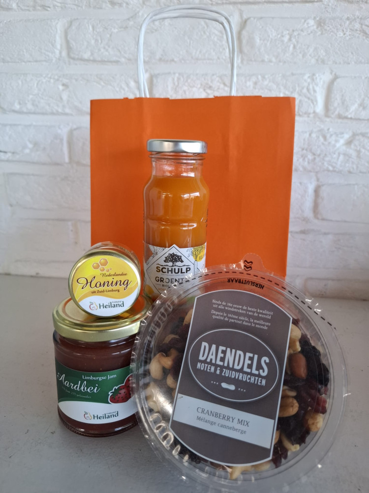 Een lekker gevuld tasje met een gezond sapje, mini honing, aardbeien jam een een nootje erbij.