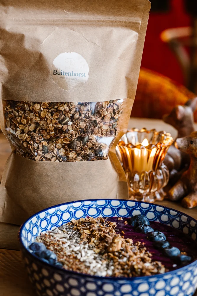Omdat we onze granola elke week zelf bakken, ben je altijd verzekerd van een verse en krokante granola.