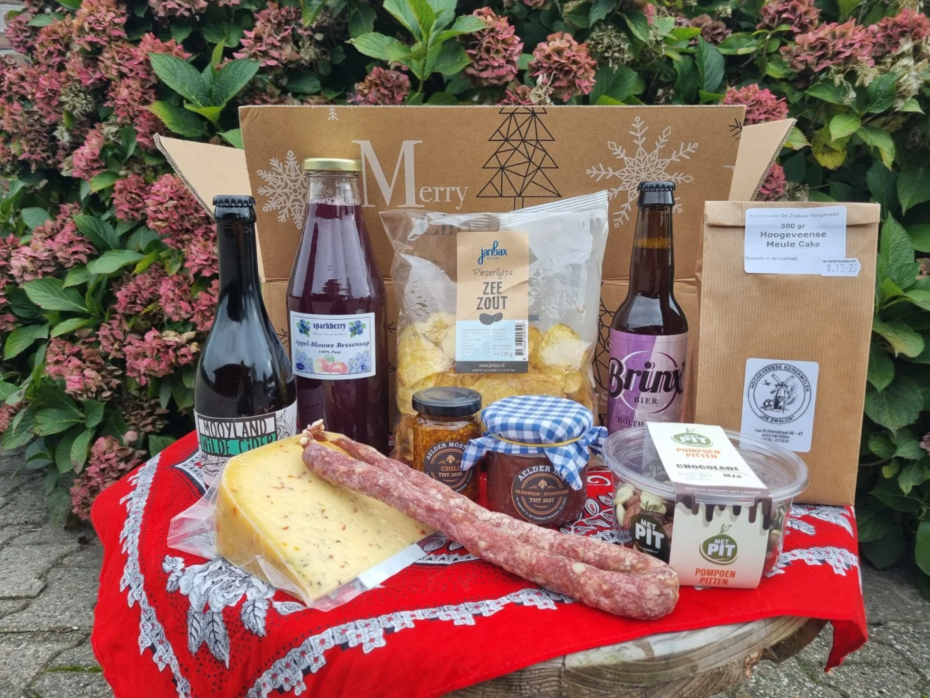 Runder droge worst, stukje kaas, mosterd, pompoenpitten met een smaakje, keuze uit 2 biertjes 2 cider of van beide 1, zakje chips, cakemix, fles sap & jam
