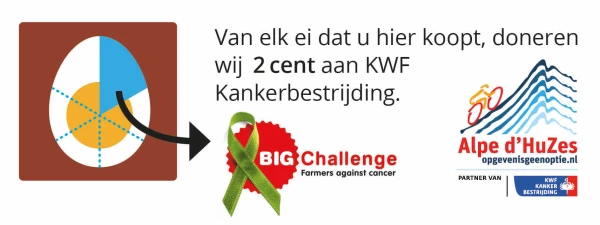 BIG Challenge, farmers against cancer doet jaarlijks mee aan het evenement: de Alpe d’HuZes. Een uniek sportief event waarbij zoveel mogelijk geld wordt ingezameld voor onderzoek naar kanker. Dit geld wordt ingezet bij KWF voor onderzoek dat dagelijks levens verandert. Zoals KWF het zelf verwoordt: “Niemand meer dood aan kanker, dat wil jij toch ook?" Dus jij heerlijke gezonde eieren en wij dragen er een gedeelte van af aan KWF.