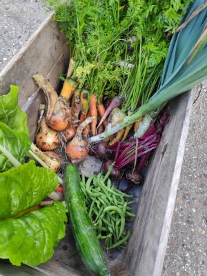 Koop dit product en je kunt een maand lang groenten bij ons afhalen. De groenten telen zelf en zijn onbespoten. Het is afhankelijk van het seizoen wat je krijgt. Enkele voorbeelden zijn op de foto's weergegeven.