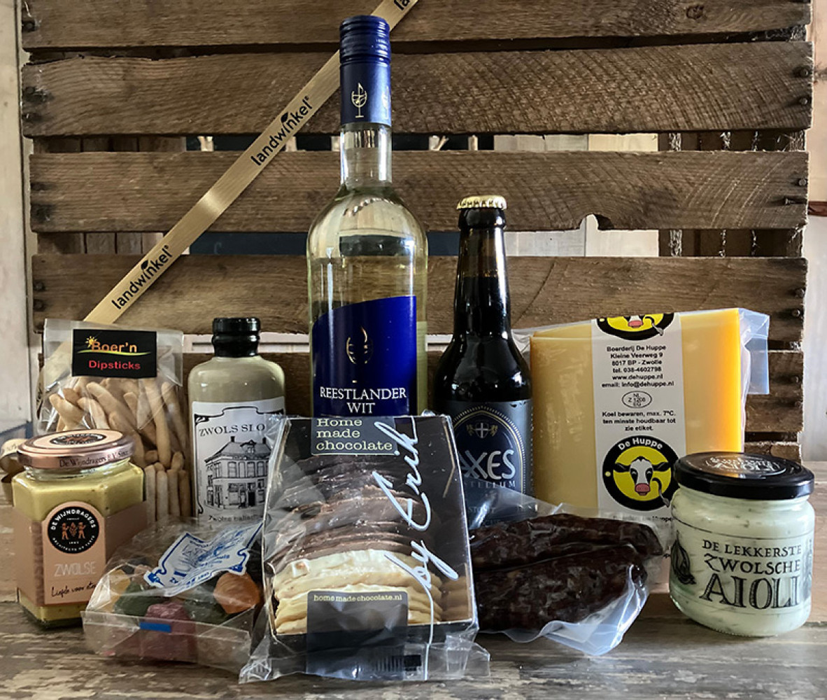 Cadeaupakket voor een gezellige borrel gevuld met streekproducten.