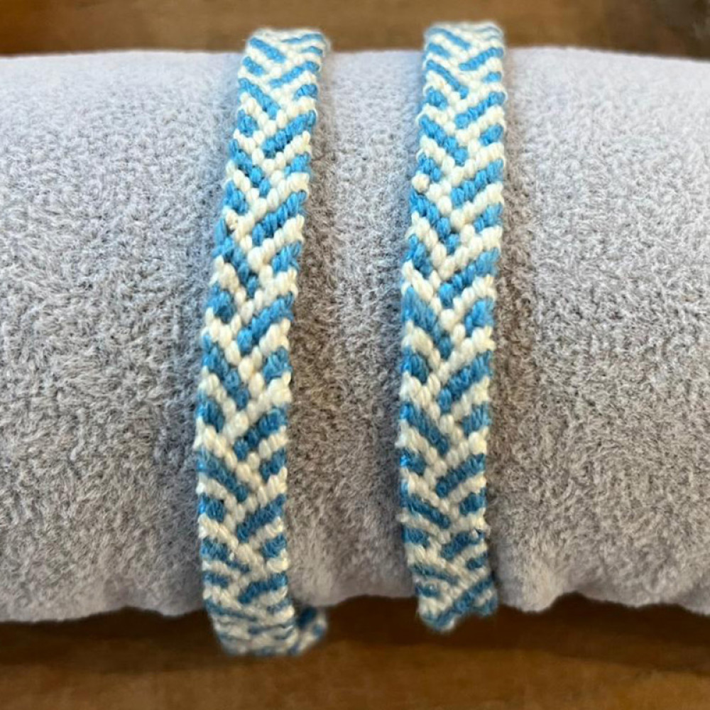 Katoenen armband, handgemaakt. Kruislings geknoopt met lichtblauw en wit.