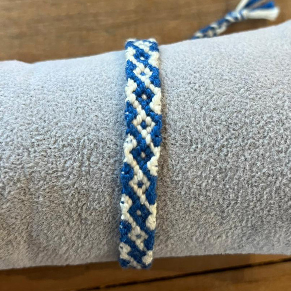 Katoenen armband, handgemaakt. Diagonaal geknoopt, blauw met wit.