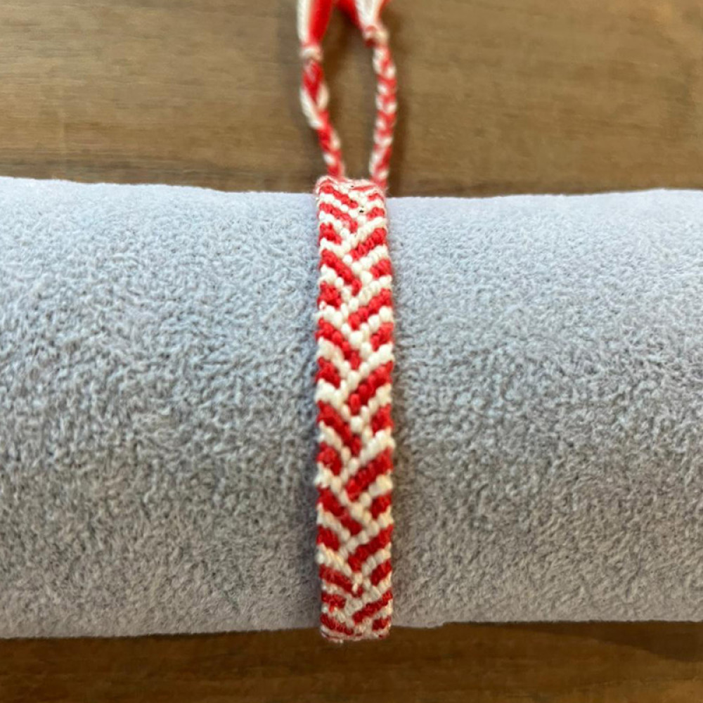 Katoenen armband, handgemaakt. Kruislings geknoopt, rood met wit.