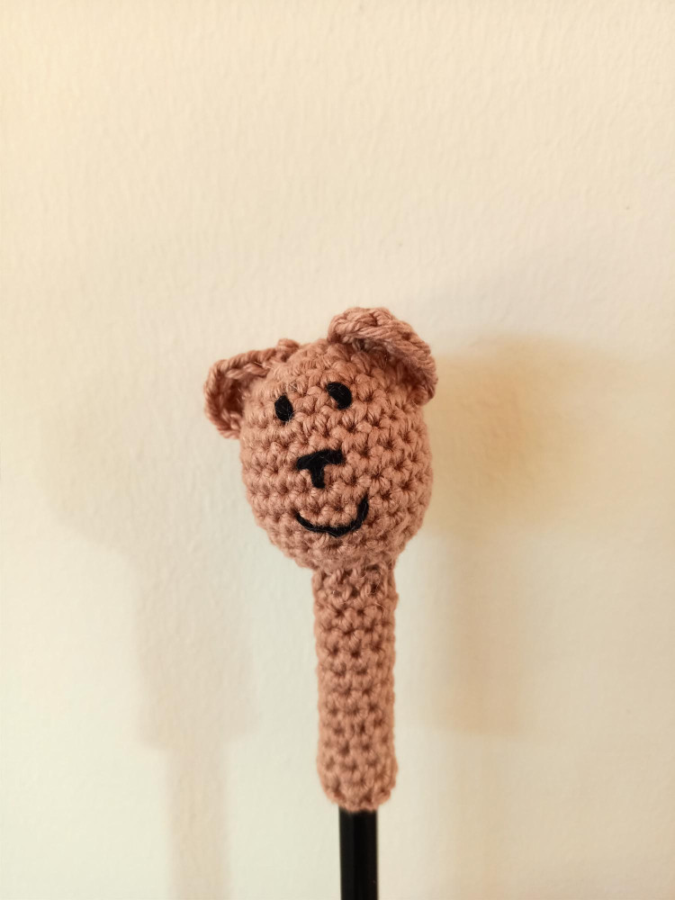 Handgemaakte, gehaakte bruine beer, voor versiering van je potlood.
