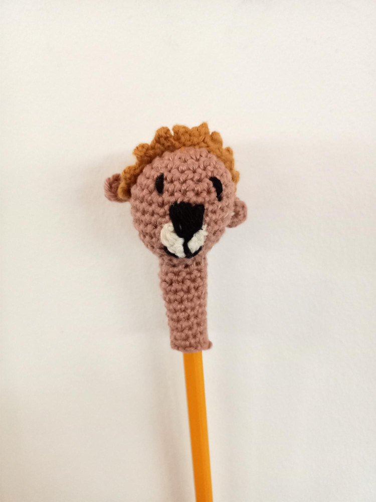 Handgemaakte, gehaakte leeuw, voor versiering van je potlood.