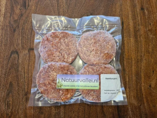 Bereidingstips voor de Natuurvallei hamburgers: Ontdooi de hamburgers in de koelkast en haal ze 30 minuten voor bereiding uit de koeling. Verhit boter in de pan of gebruik een grillpan/barbecue op middelhoog vuur. Bestrijk de hamburgers lichtjes met olie en bak ze 4-5 minuten per kant, tot ze een kerntemperatuur van 70°C hebben.
