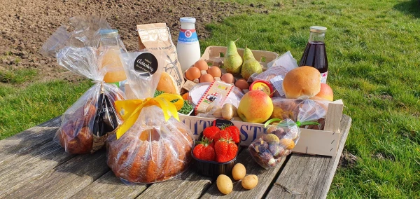 2 dozen eieren, 2 flessen puur sap, lekkers van de bakker, kaas van de boerderij, paasstol, afbakbroodjes, 6 kleine bolletjes, bavarois, mix van vers fruit, boeren yoghurt, granola, salade, pannenkoekmeel, stroop, jam, lente groenten, kalkoenrollade om warm te eten, krieltjes, paaseitjes.