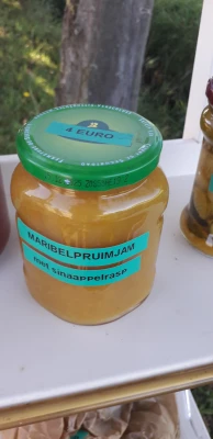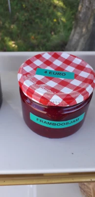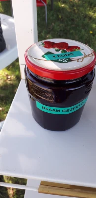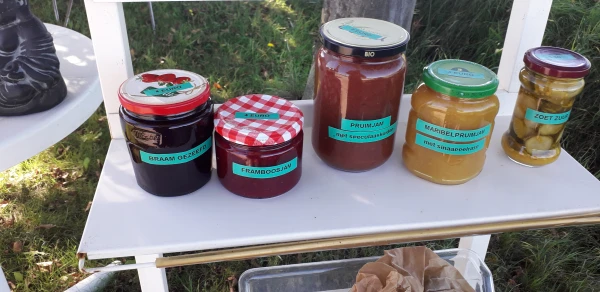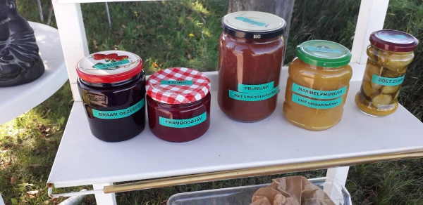 Eigengemaakte biologische jam van eigen fruit, zoals Braamjam gezeefd, Framboosjam, Pruimjam met speculaaskruiden, Maribelpruimjam met sinasappelrasp en komkommers zoet/zuur