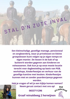 Een kleinschalige, gezellige manege, pensionstal en zorgboerderij, waar je privelessen en kleine groepslessen kunt volgen op je eigen tempo en eigen manier. De lessen in de bak of op buitenrit worden gegeven aan kinderen en volwassenen. Ook kun je op onze mooie locatie terecht voor dagbesteding op basis van PGB, workshops, kinderfeestjes en verhuur van de gezellige kantine met keuken. Kinderfeestjes kunnen met en zonder paarden/ponys gegeven worden.