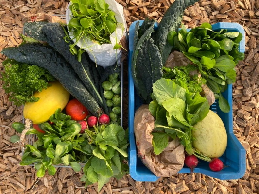 We telen zo’n vijftig soorten groenten. Het seizoen begint met raapstelen, spinazie en tuinbonen. In de zomer zijn er volop tomaten, bonen en courgettes te oogsten en in de herfst kun je genieten van boerenkool, knolselderij en pompoenen.