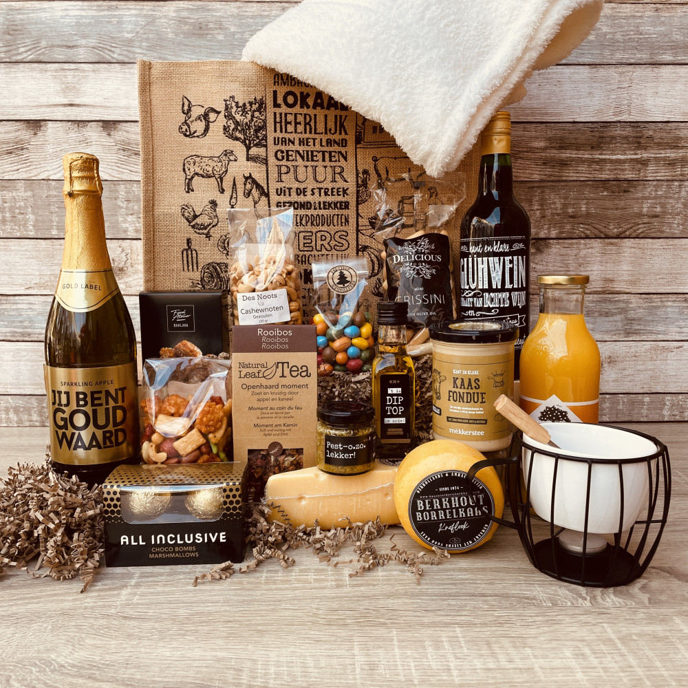Van een gezellige kaasfondue en luxe bubbels tot een warme knuffeldeken voor op de bank. Dit pakket bevat alles voor de ultieme, onvergetelijke kerst. Het perfecte, luxe relatiegeschenk of het ultieme kerstcadeau om uw medewerkers te tonen dat ze écht goud waard zijn.